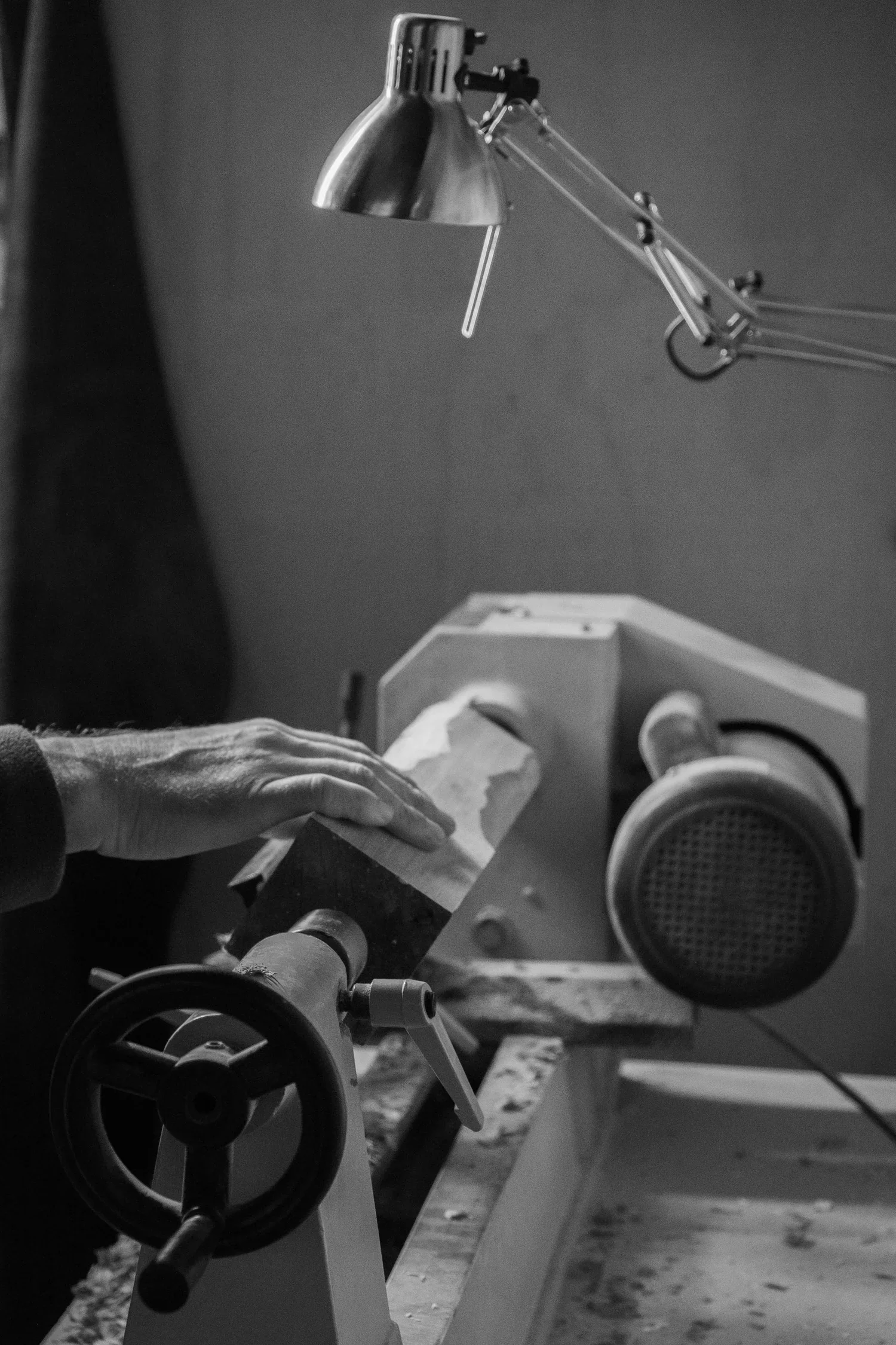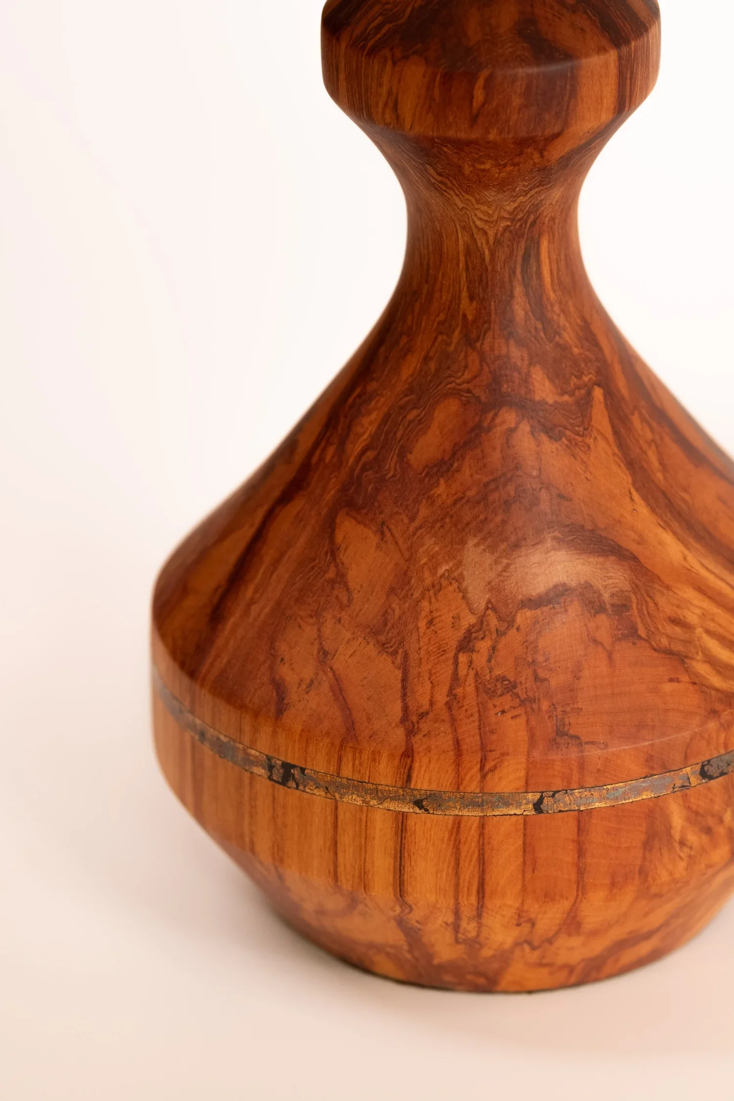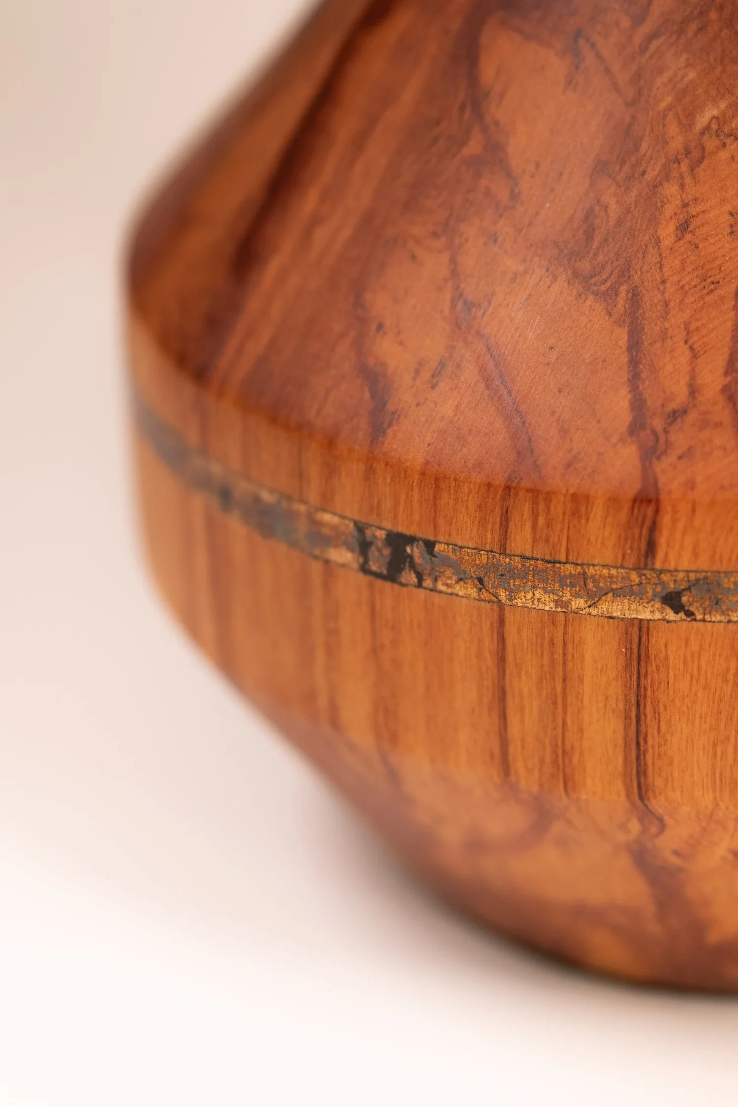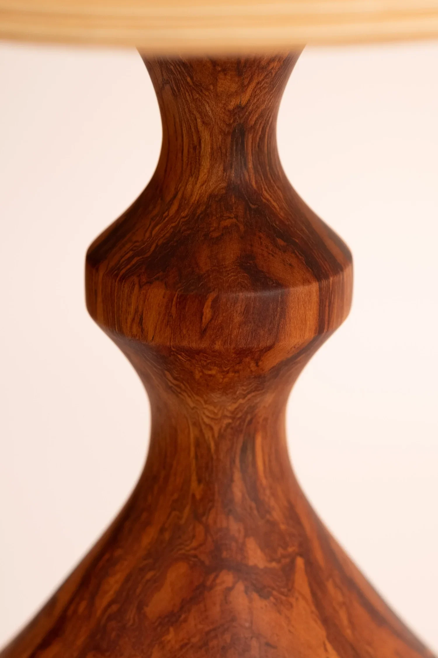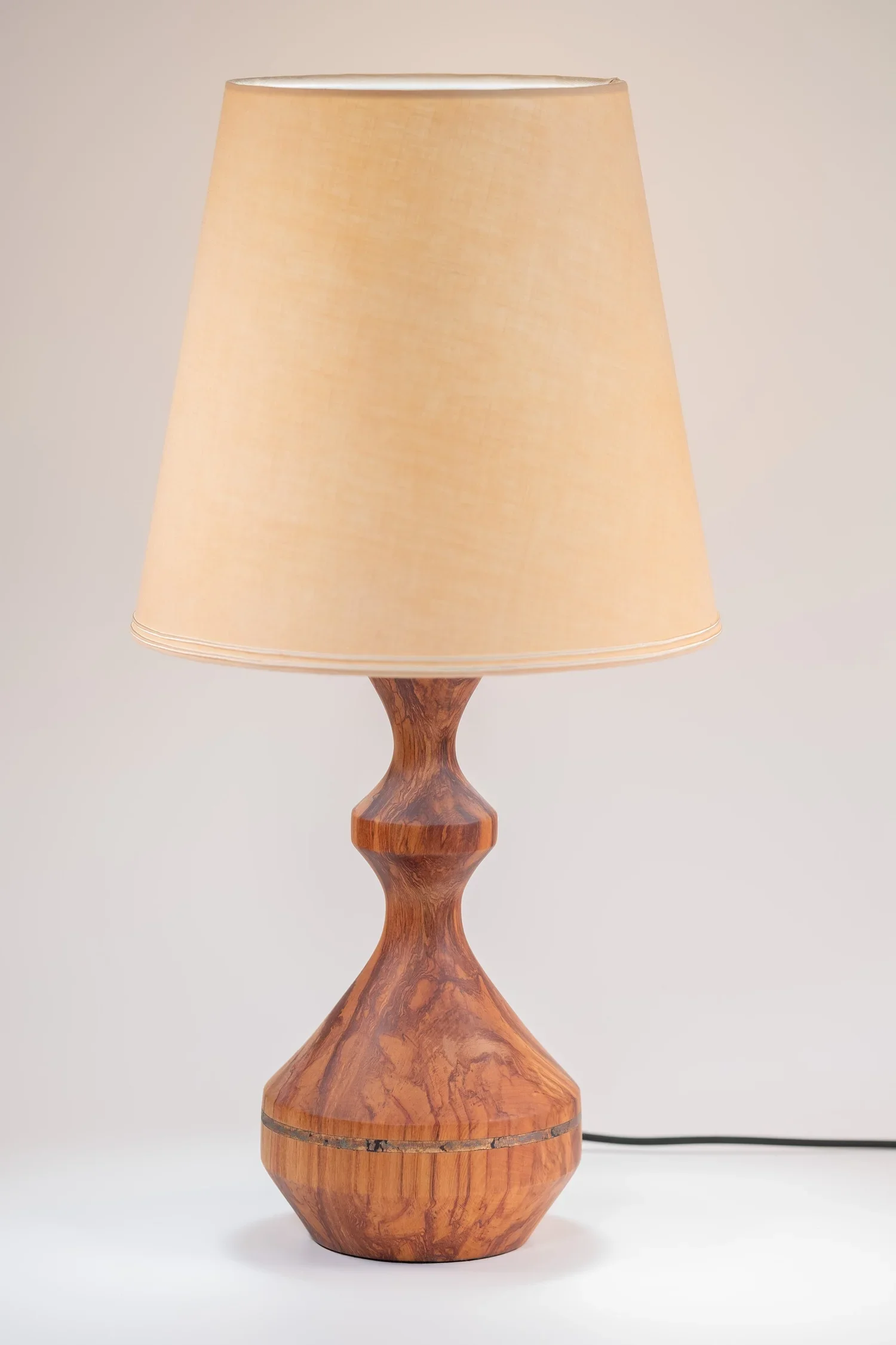 This exquisitely crafted lamp from Nick Erickson Studios is made from a windswept Rimu limb. The soft glow cast buy the Lumina will add cosiness to any space. The lamp is coupled with a conical lampshade that is hand dyed with onion skin and carrots, giving the shade a light, yet vibrant orange hue. The detailing of the band around the base is created with gilded and patinated silver.