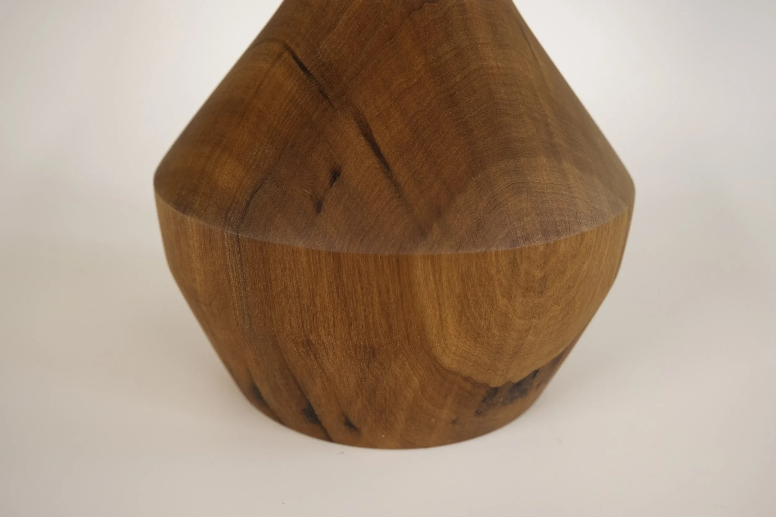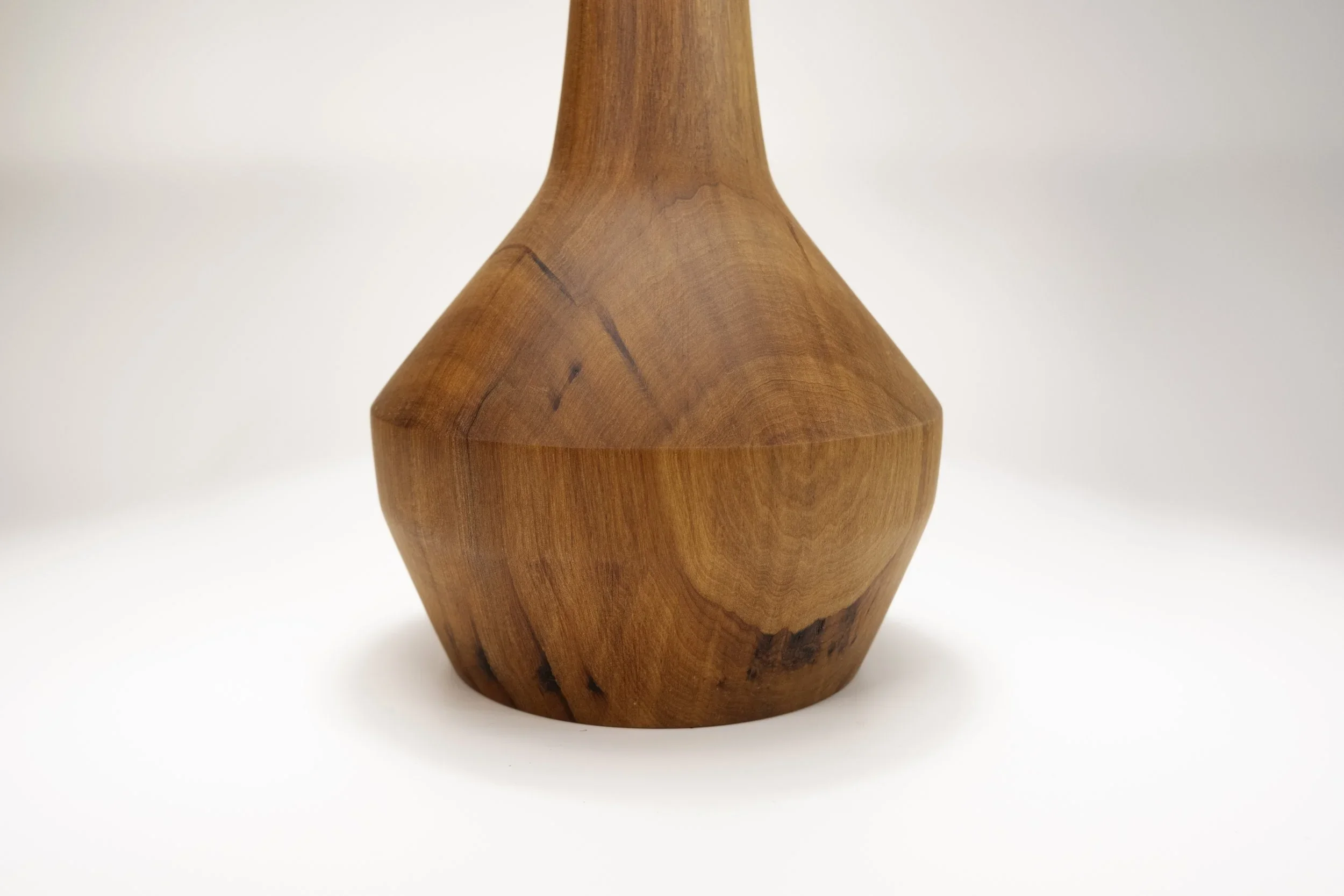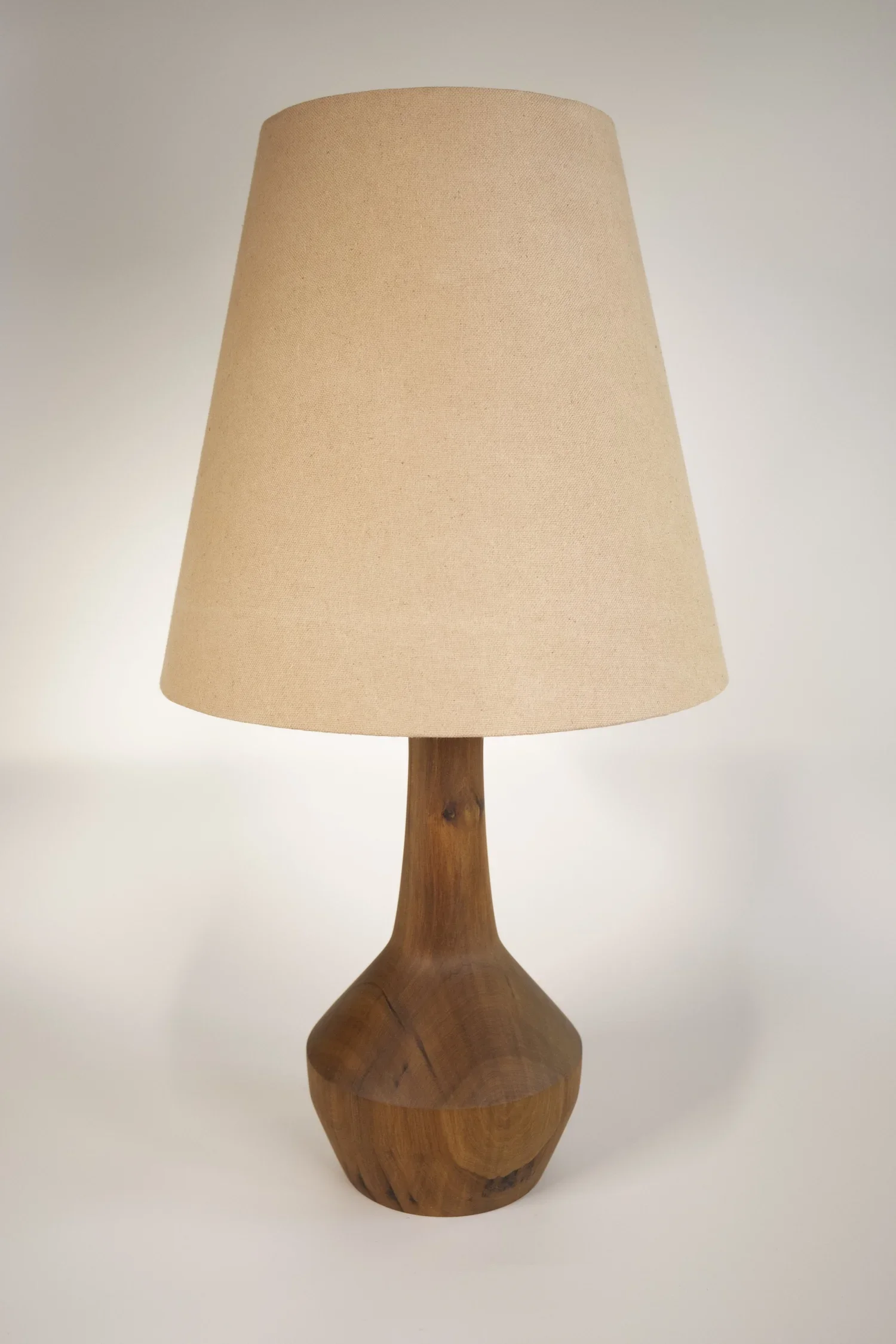 The Tōtara Enclave from Nick Erickson Studios showcases a gracefully contoured profile, shaped from reclaimed Tōtara. The lamp's elegant design emphasizes the wood's deep, earthy hues. Paired with a conical lampshade hand dyed with avocado pips and skins resulting in a gentle pink hue. This piece emits a warm and tranquil glow which will add a subtle charm to any room